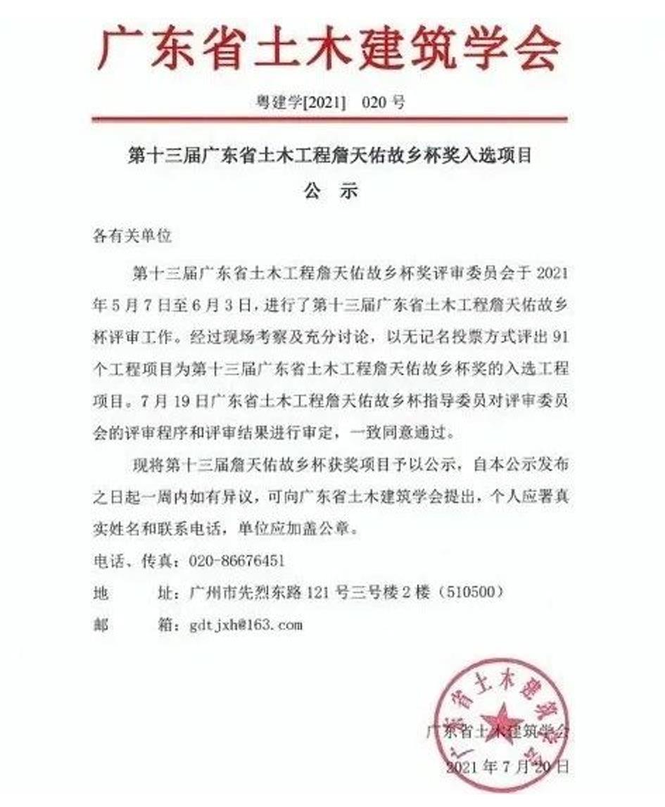 “詹天佑故鄉(xiāng)杯”是廣東省土木建筑工程科技創(chuàng)新領(lǐng)域的最高榮譽獎,是面向全省已建成的土木建筑工程,在確保安全、優(yōu)質(zhì)的前提下,以提倡科技創(chuàng)新、執(zhí)行節(jié)能、節(jié)地、節(jié)水、節(jié)材以及環(huán)保、循環(huán)經(jīng)濟和可持續(xù)發(fā)展方針的科技創(chuàng)新工程。