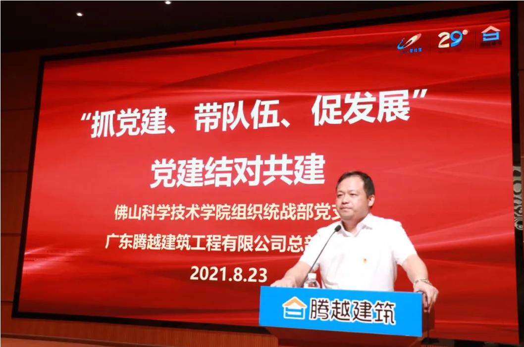 2021年8月23日,騰越建筑黨委與佛山科學技術(shù)學院組織統(tǒng)戰(zhàn)部黨支部隆重召開“抓黨建、帶隊伍、促發(fā)展“黨建結(jié)對共建活動。佛山科學技術(shù)學院黨委書記、教授曾崢等一行領(lǐng)導及組織統(tǒng)戰(zhàn)部黨支部相關(guān)黨員干部,碧桂園黨委委員、騰越建筑黨委書記、總經(jīng)理馬小軍,黨委副書記、執(zhí)行總經(jīng)理鄧培初等黨委委員出席活動。