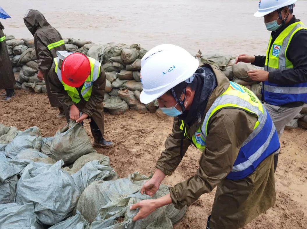 隨后,全體搶險(xiǎn)鐵軍頂著風(fēng)雨馬不停蹄地投入河岸堤壩加固工作,從一鐵锨一鐵锨分裝沙袋開(kāi)始,手把手,肩靠肩。雖然汗水、雨水、泥水浸透衣衫,但大家都憋著一股勁,就是汛情不解除,我們不后退。奮戰(zhàn)歷經(jīng)三個(gè)小時(shí),終于趕在夜間6點(diǎn)洪峰過(guò)境前,成功完成近500袋沙袋加固任務(wù)。