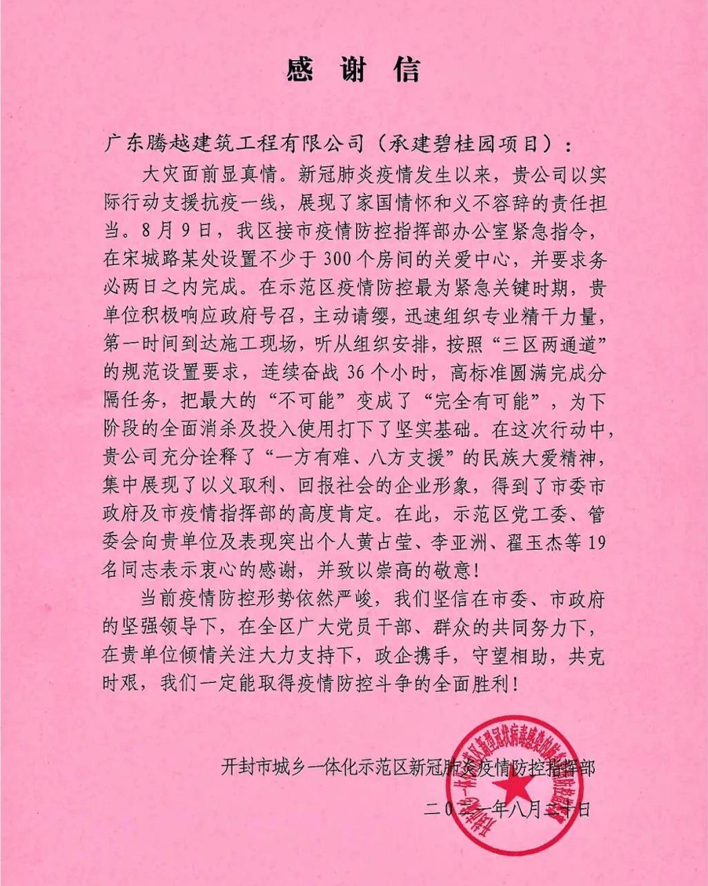 河南公司開(kāi)封天璽項(xiàng)目收到開(kāi)封城鄉(xiāng)一體化示范區(qū)住建局新冠肺炎疫情防控指揮部感謝信