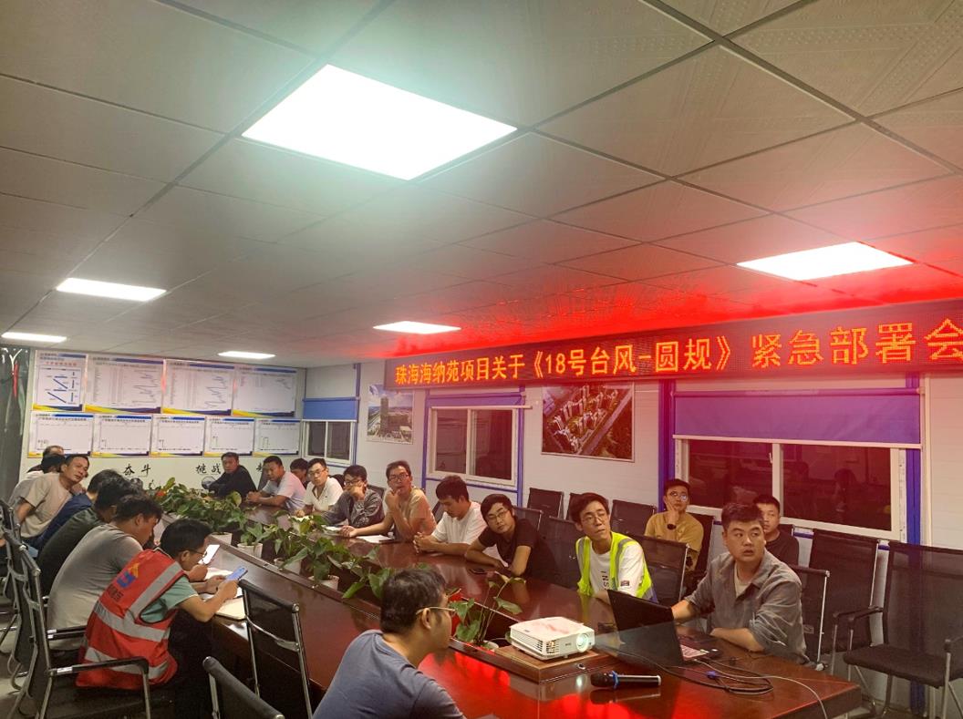 各個項目紛紛召開臺風(fēng)應(yīng)急部署專項會議,對項目防臺風(fēng)事項有效進行分解落實,同時通知各分包單位,由專業(yè)人員帶隊,對現(xiàn)場的大型設(shè)備及其重點部位進行全面排查,做好臺風(fēng)登錄前的各項準備措施。