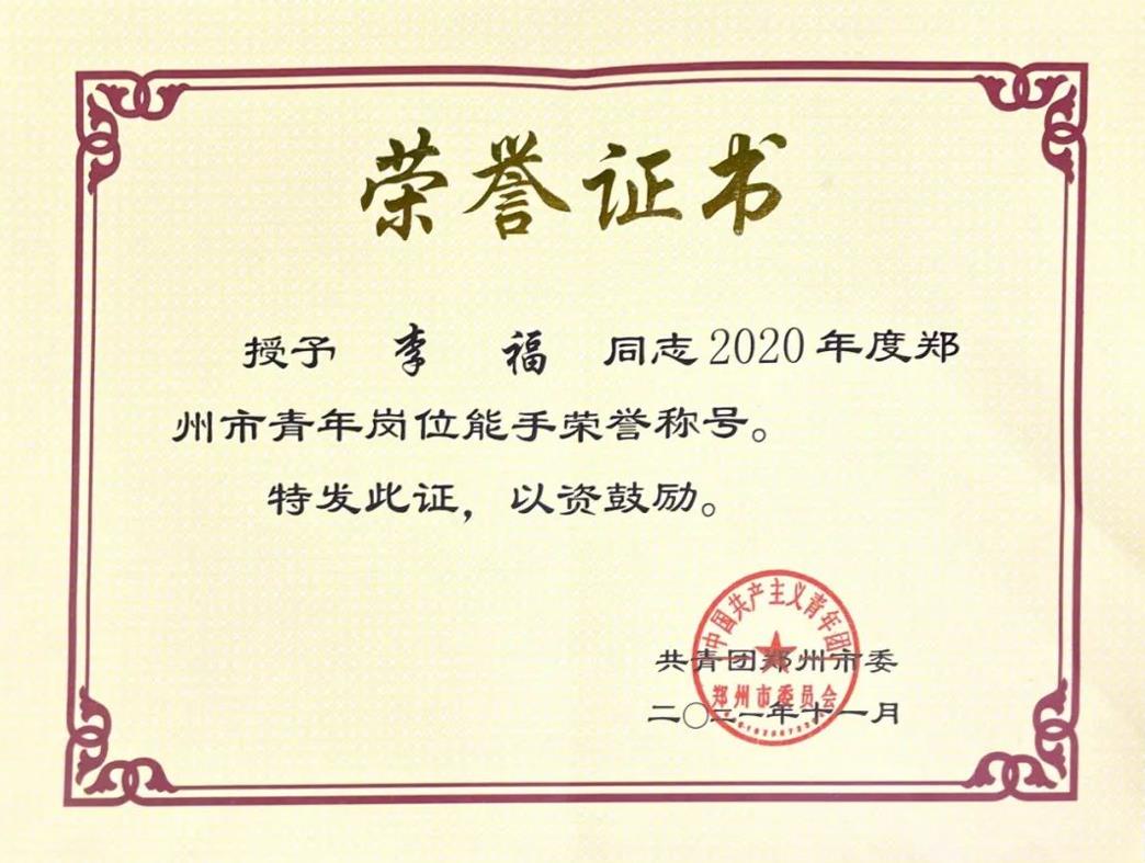 也被評(píng)為“2020年度鄭州市青年崗位能手”榮譽(yù)稱(chēng)號(hào)
