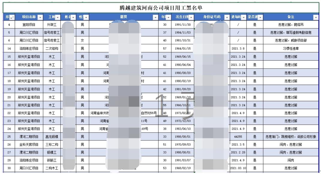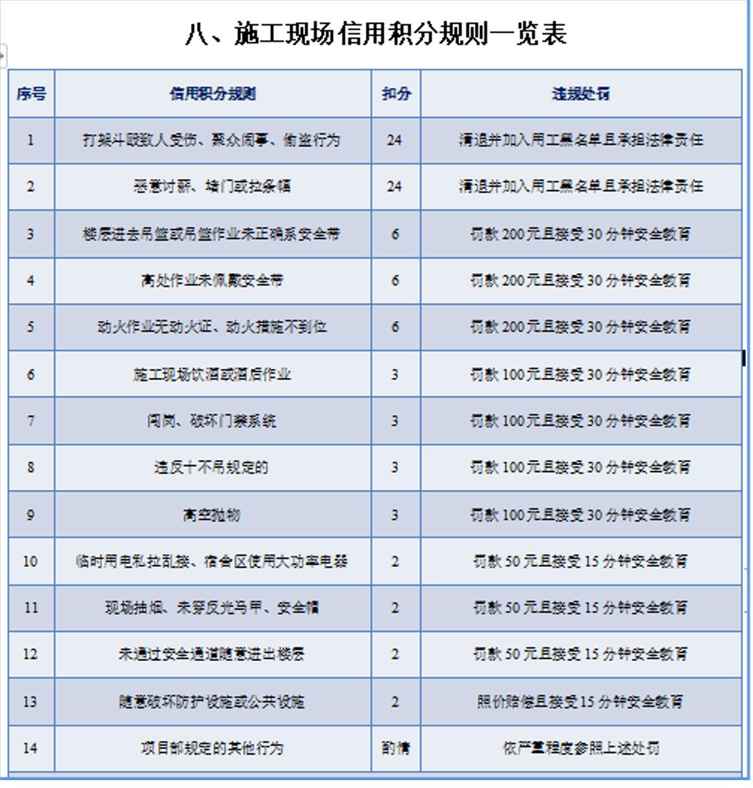 項目嚴格執(zhí)行公司安全管理條例及河南公司安全管控考核管理制度,同時建立云端數(shù)據(jù)庫2021年河南公司信用體系,類比道路交通管理,將習慣性違章、聚眾斗毆、惡意討薪等工人拉入黑名單,再將用工信息及黑名單作業(yè)人員信息共享,嚴禁黑名單作業(yè)工人進入河南公司在建項目,確保用工安全。