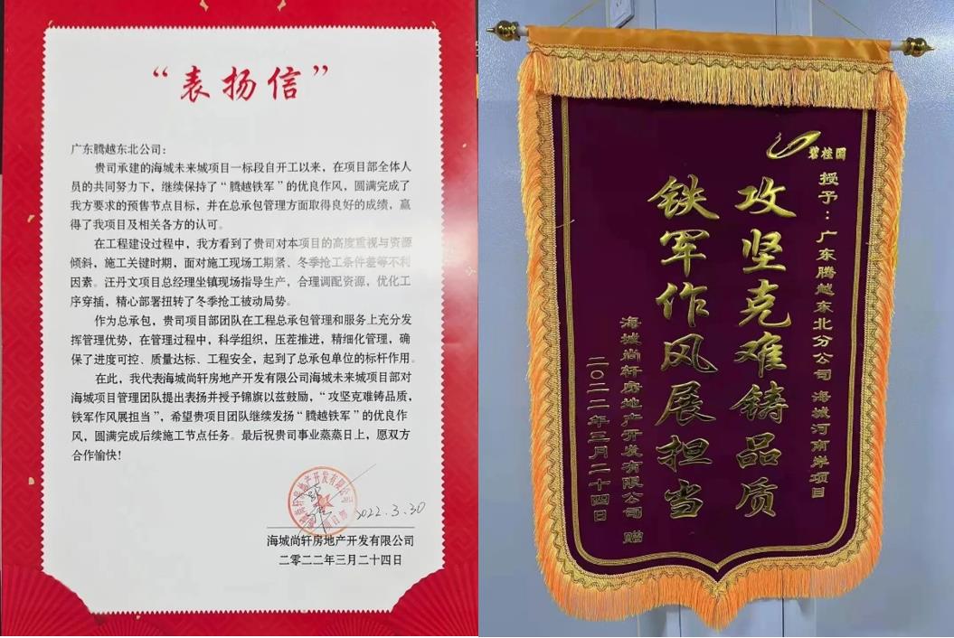 寒冷的氣溫,對混凝土及管理人員都是極大的考驗,旁站的項目鐵軍臉蛋通紅,嘴唇干裂,3月26日,在全體同心協(xié)力的緊密配合下,完美完成預售節(jié)點,提前3天完成任務,甲方為海城碧桂園河南岸項目團隊還發(fā)來“表揚信”并授予項目“攻堅克難鑄品質(zhì),鐵軍作風展擔當”錦旗。