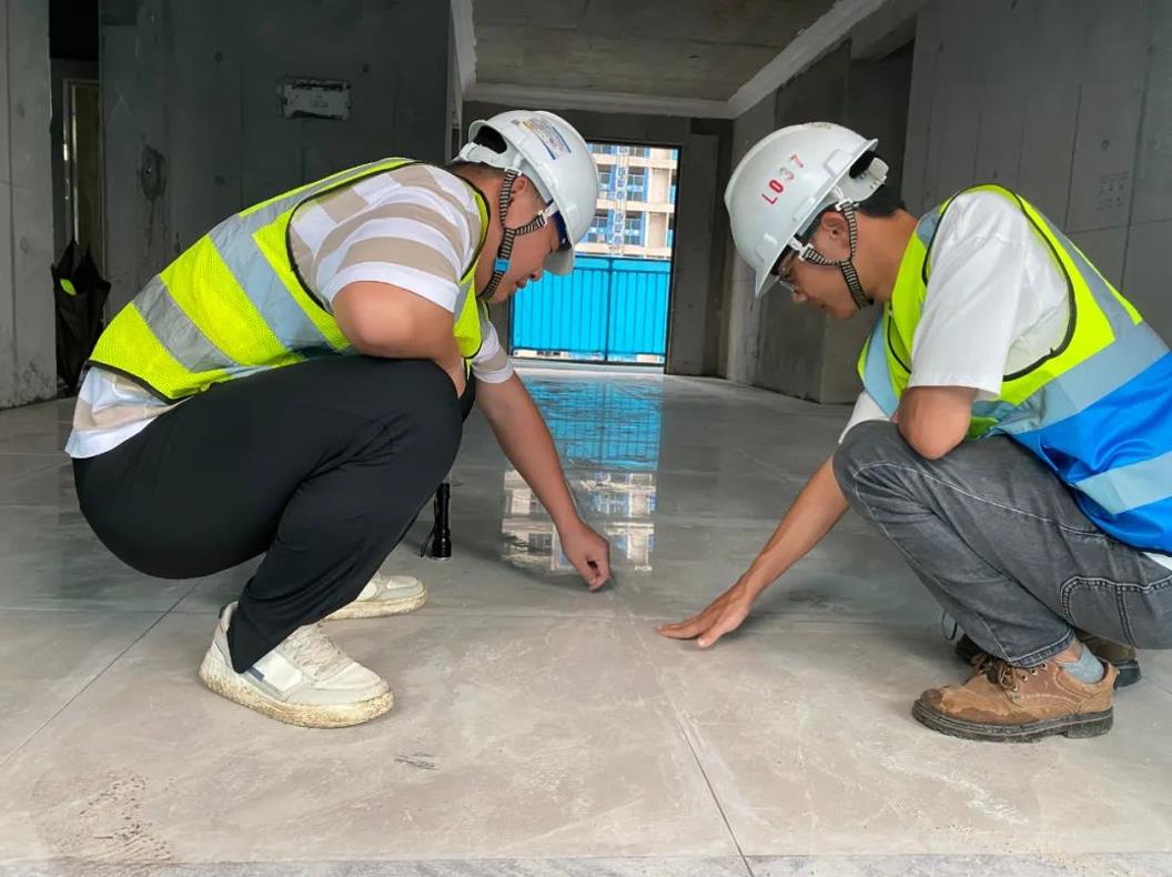 李城與同事正在分析客廳地磚高低差產(chǎn)生的原因