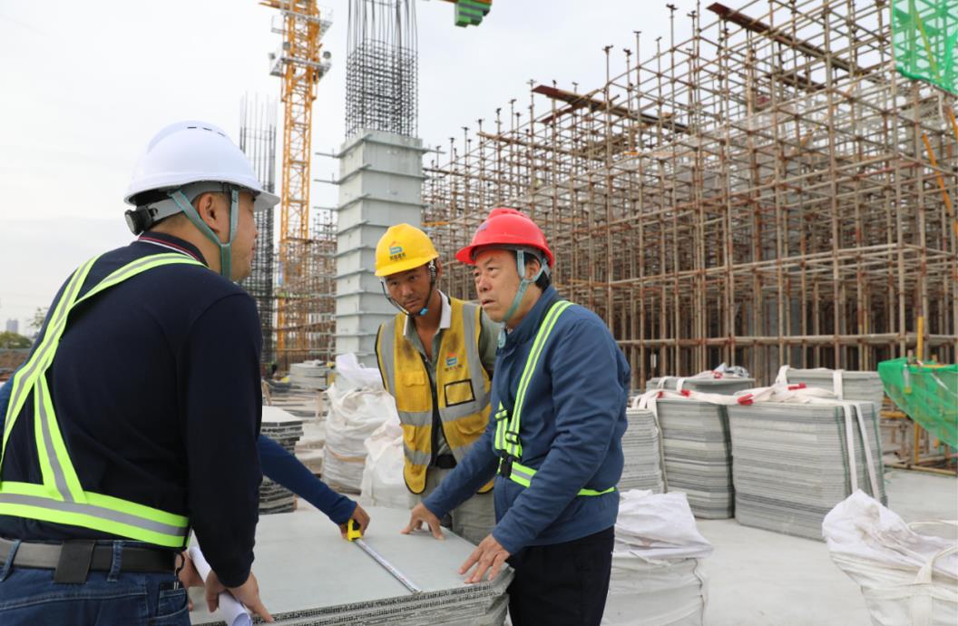 △集團(tuán)董事局主席楊國(guó)強(qiáng)在項(xiàng)目現(xiàn)場(chǎng)了解新型塑料模板的使用情況